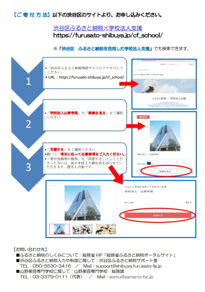 本制度を通じてお寄せいただいたご寄附は、渋谷区の事務手数料を差し引いた約80%が学校法人へ寄附されます。