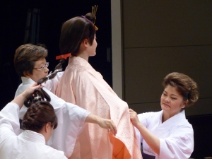 ▲ジェーン校長先生による十二単の着付け。モデルは2年の鈴木さん。
